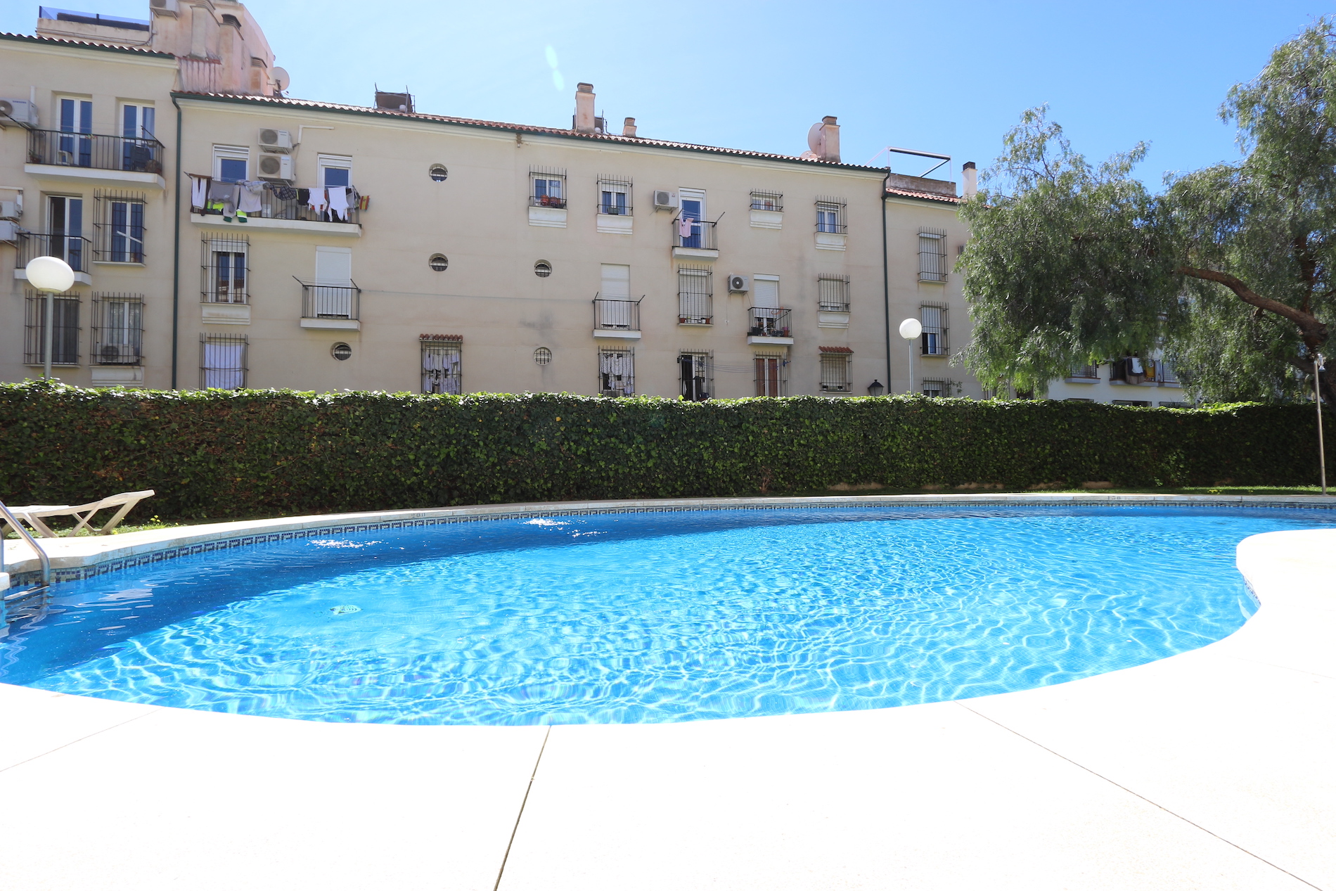 The residential complex offers a swimming pool, garden, and communal areas.