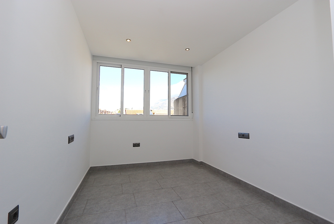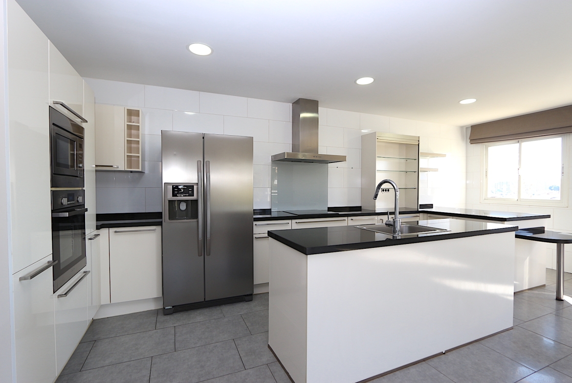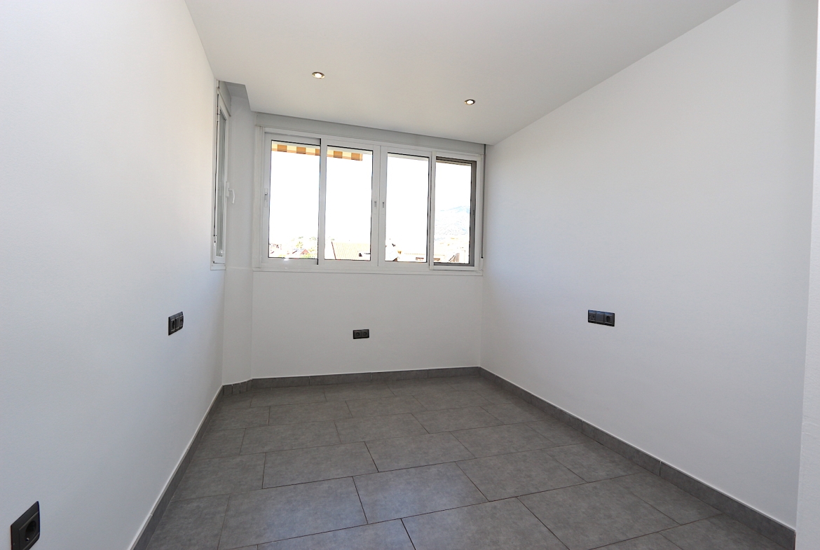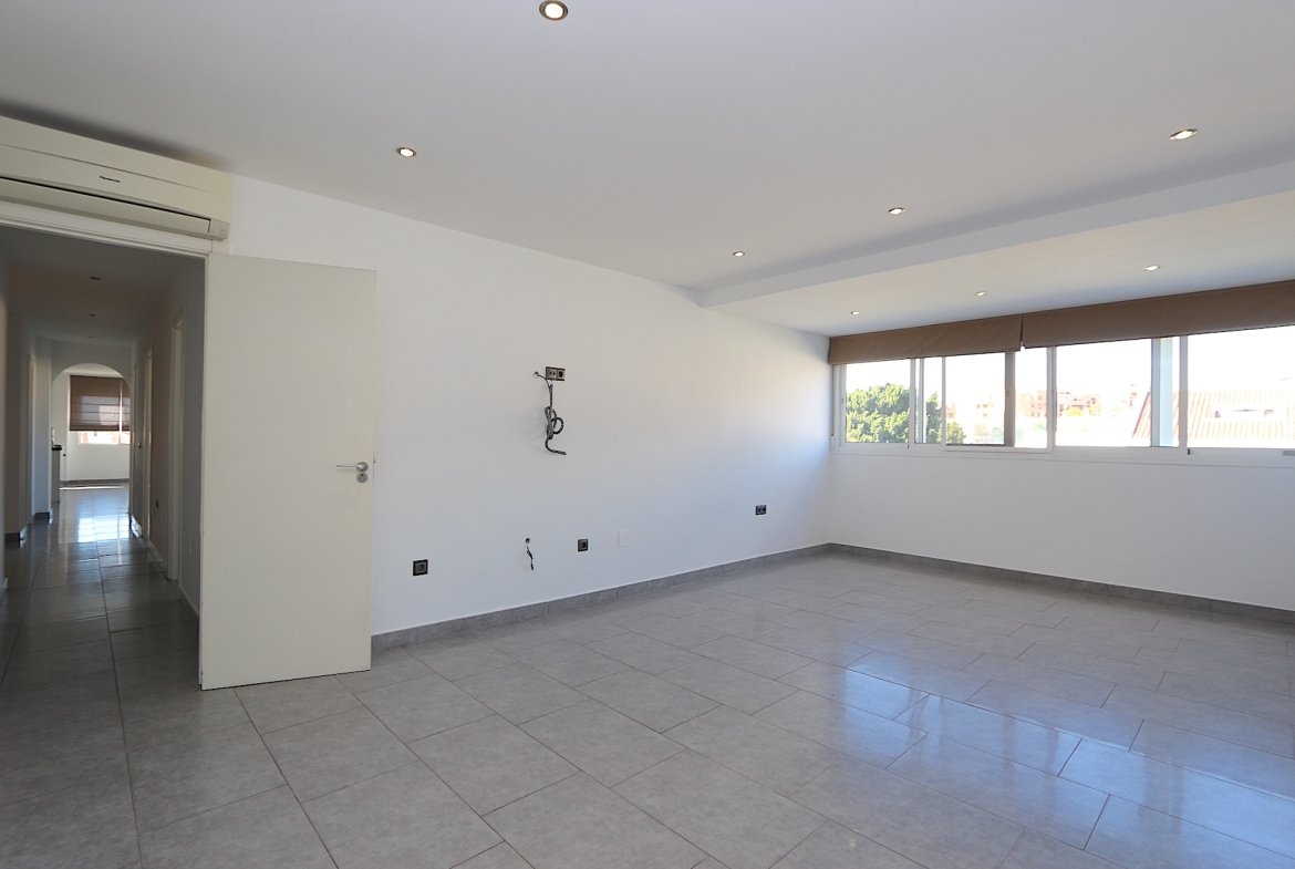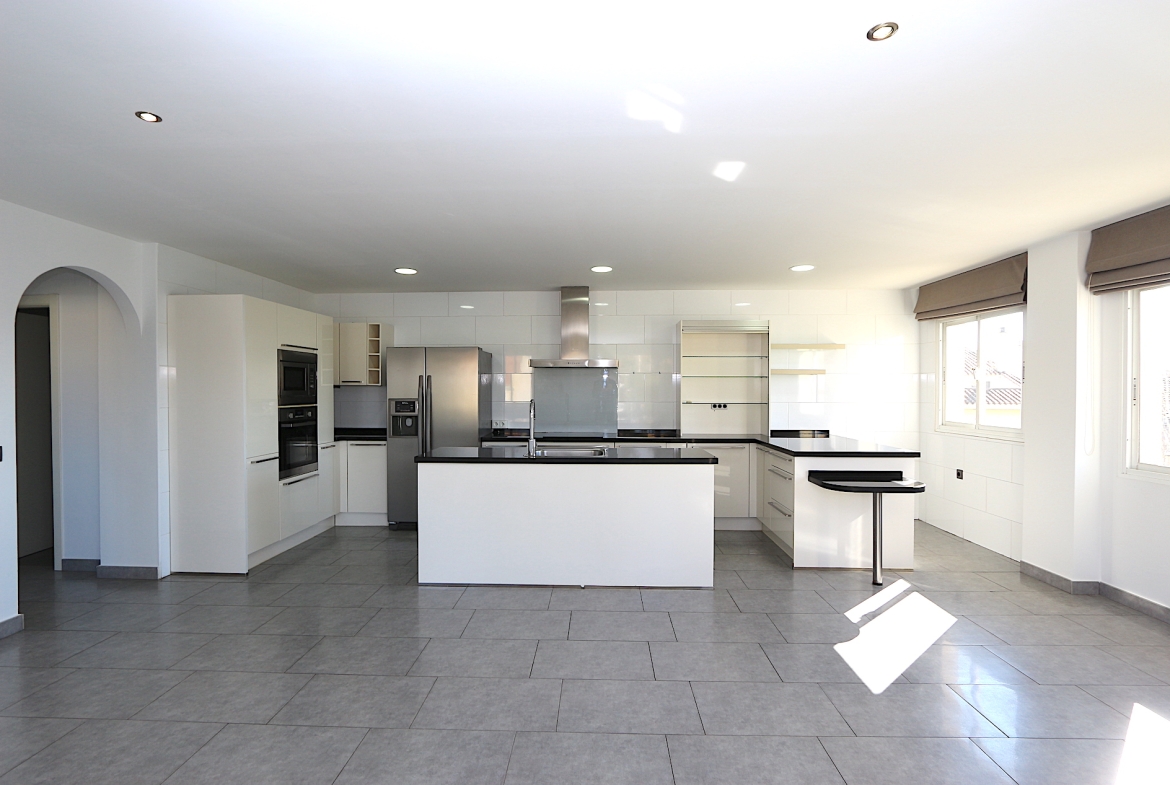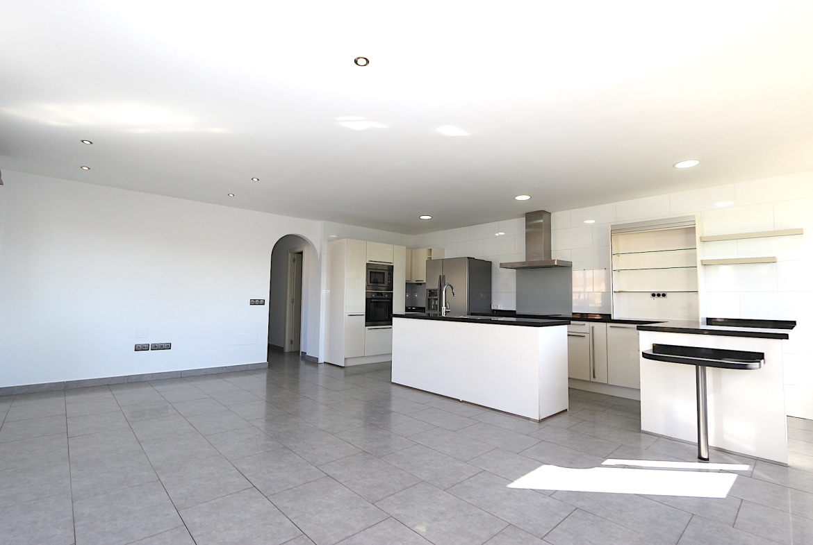 At the heart of the property is a spacious and bright living area with an open-plan, fully fitted kitchen and a practical central island — ideal for both family living and entertaining guests. From here, you step out onto a fantastic southwest-facing corner terrace with open views, perfect for enjoying the afternoon sun and beautiful sunsets.