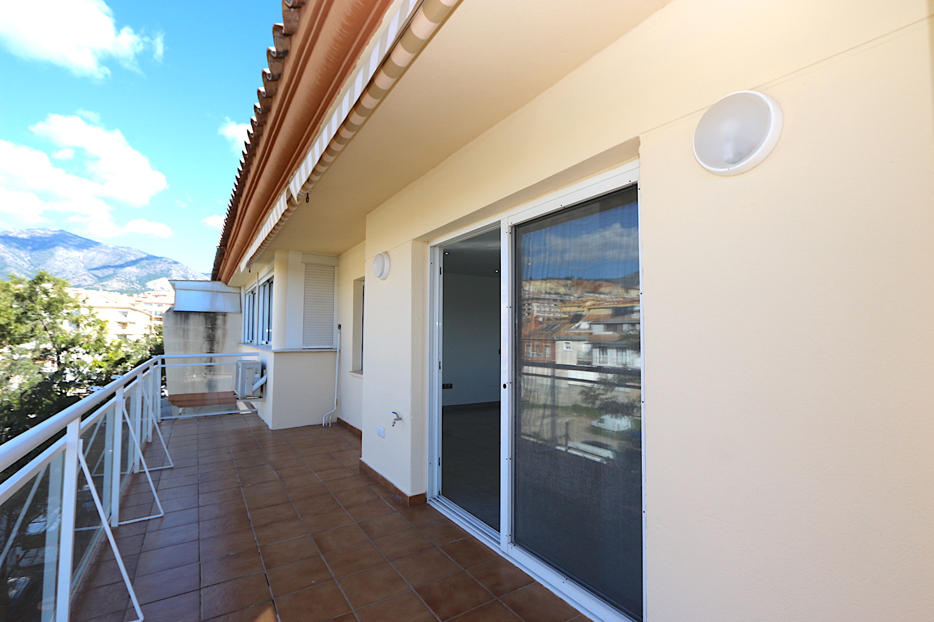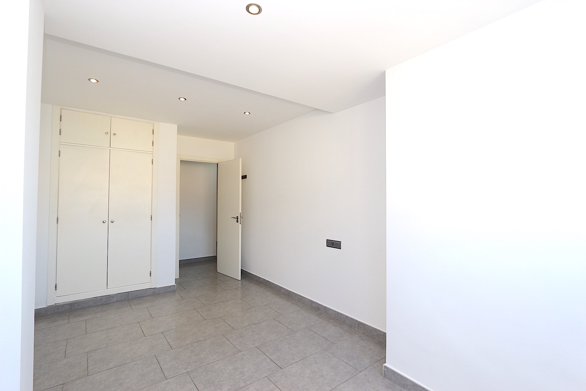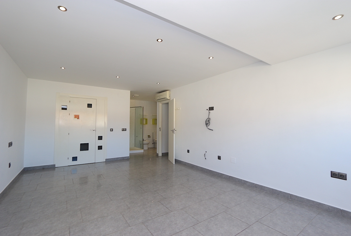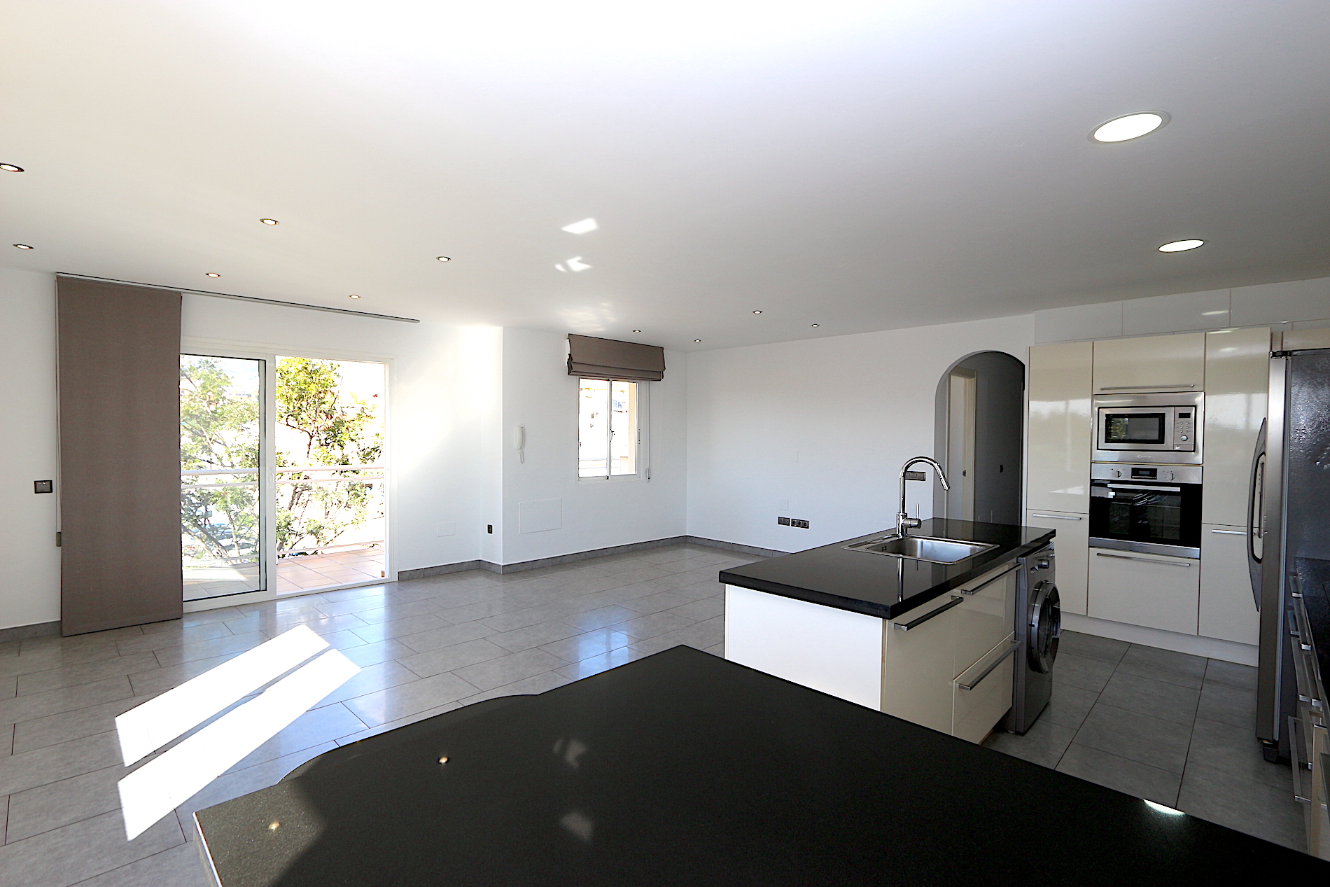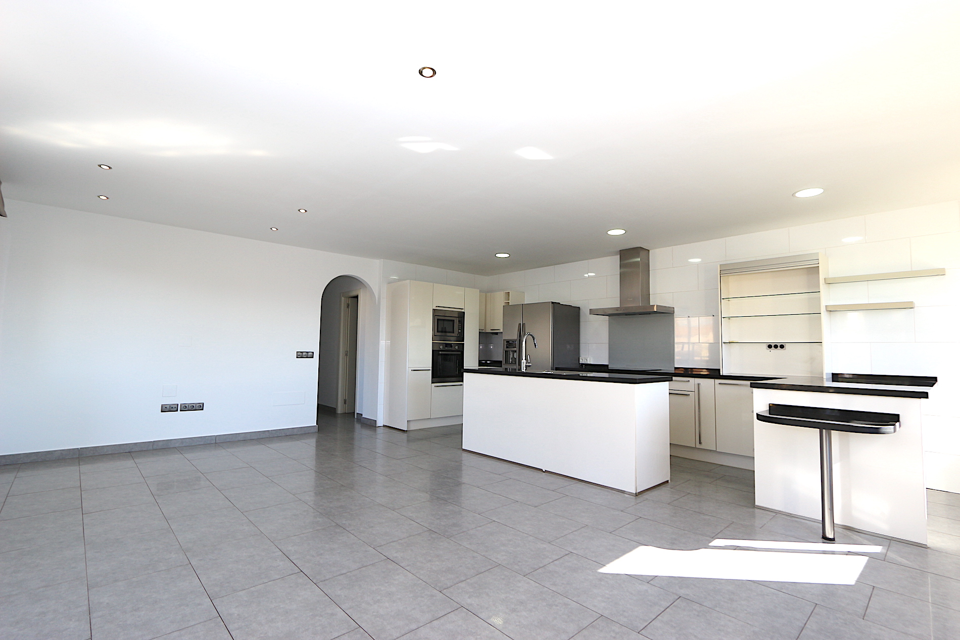At the heart of the property is a spacious and bright living area with an open-plan, fully fitted kitchen and a practical central island — ideal for both family living and entertaining guests. From here, you step out onto a fantastic southwest-facing corner terrace with open views, perfect for enjoying the afternoon sun and beautiful sunsets.