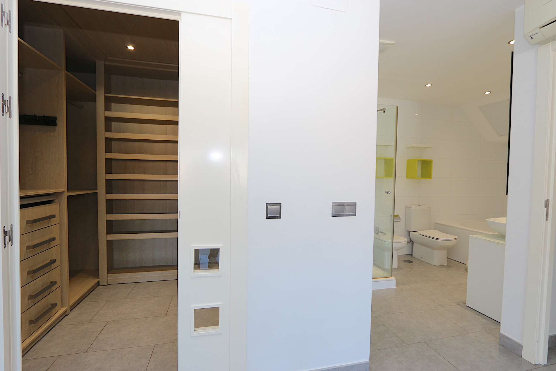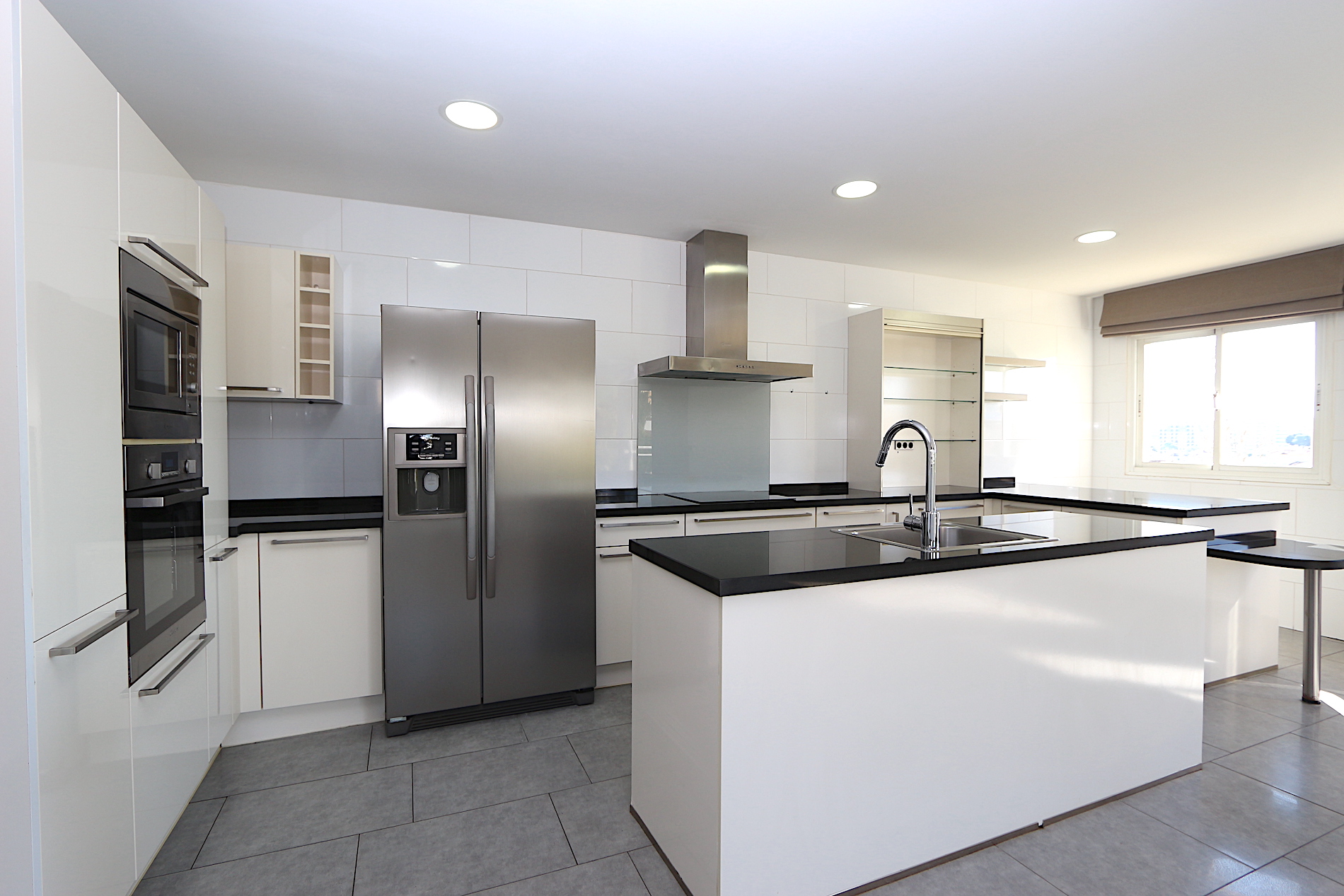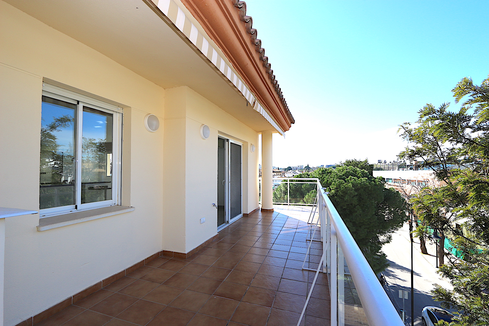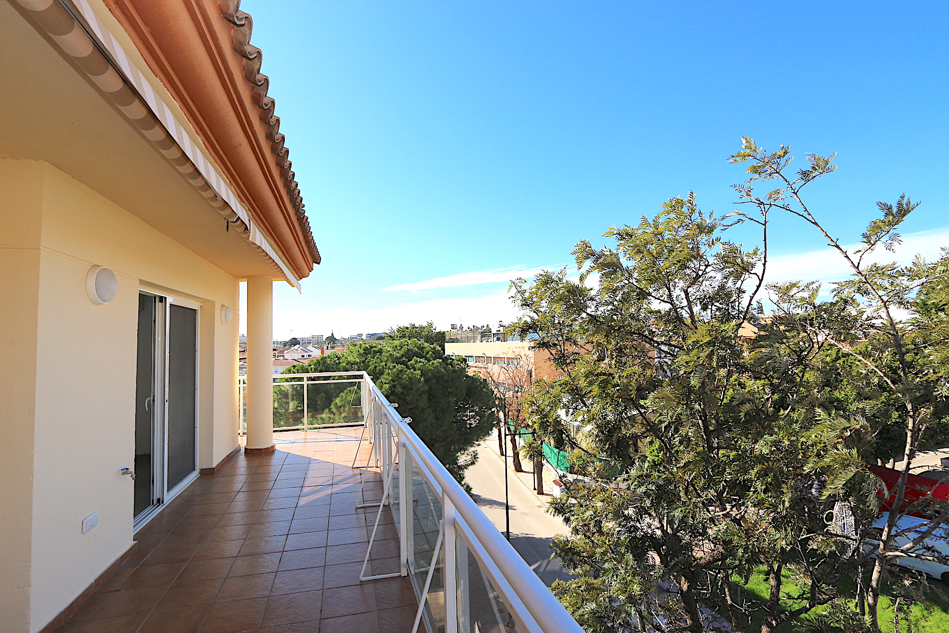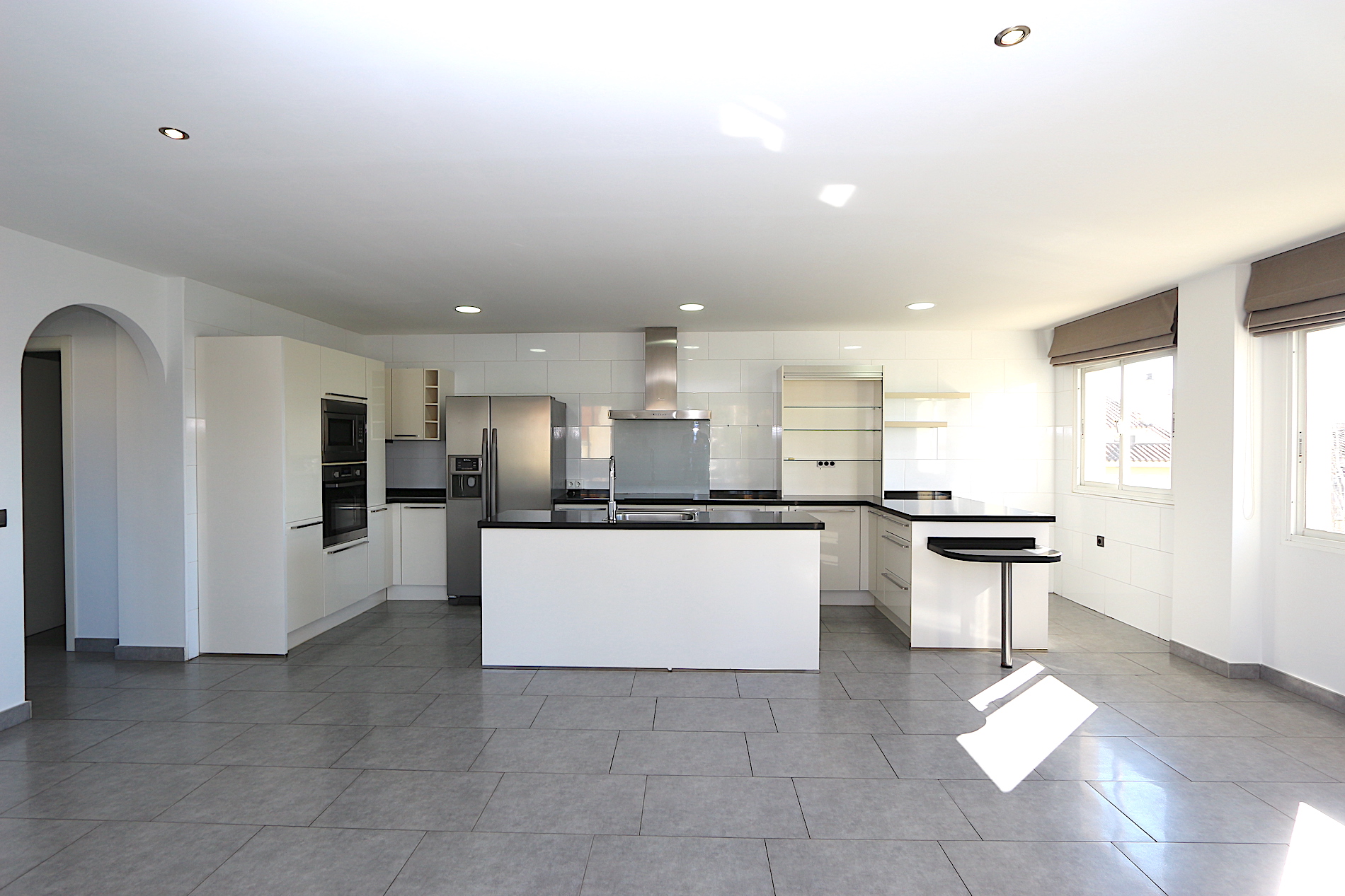 At the heart of the property is a spacious and bright living area with an open-plan, fully fitted kitchen and a practical central island — ideal for both family living and entertaining guests. From here, you step out onto a fantastic southwest-facing corner terrace with open views, perfect for enjoying the afternoon sun and beautiful sunsets.