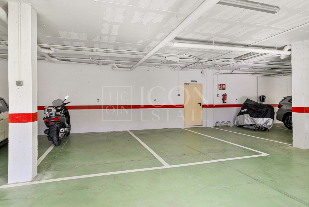 The property features centralized air conditioning on each floor, ceramic floors, and built-in wardrobes that combine style and functionality. Solar panels ensure efficient hot water production. Two adjoining parking spaces and a 7 m² storage room add extra convenience to daily life.
