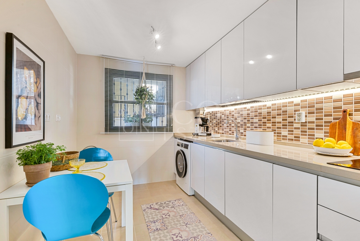 On the ground floor, you’ll find a spacious and bright living room that opens onto a cozy terrace overlooking a beautifully maintained green area, creating the perfect spot to relax and enjoy the outdoors. The independent kitchen is fully equipped with all necessary appliances. This floor also features a practical pantry and a guest bathroom with a shower — perfect for visitors.